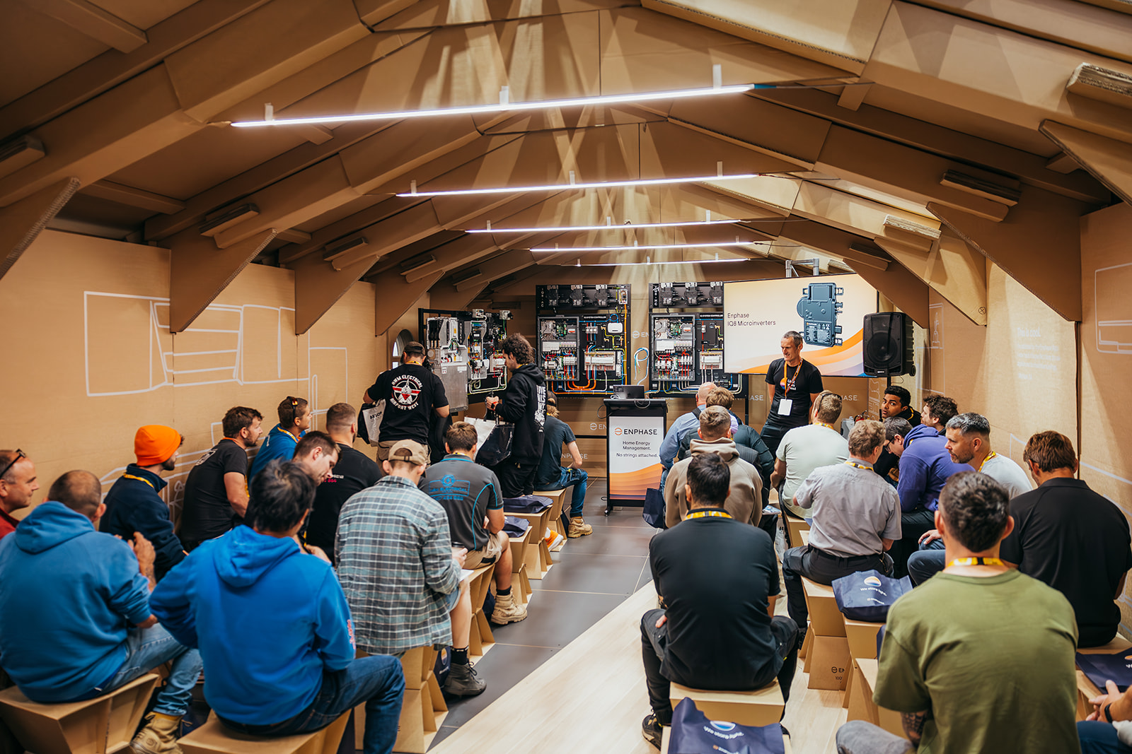 Built entirely from recyclable cardboard supplied by Opal, the striking 10 x 5.5 metre significantly reduced event waste by over 80 % - 90 %, compared to traditional expo stands. As well as turning heads, it drew a steady stream of installers eager to earn CPD (Continual Professional Development) points. Not only were the sessions fully booked, but there was a 37 % year on year increase in trained installers visiting Enphase’s stand, showing clear industry appetite for sustainable education integrated into exhibition spaces. Even competitors and major industry players stopped by, attracted by the stand’s unusual and eco-forward design.